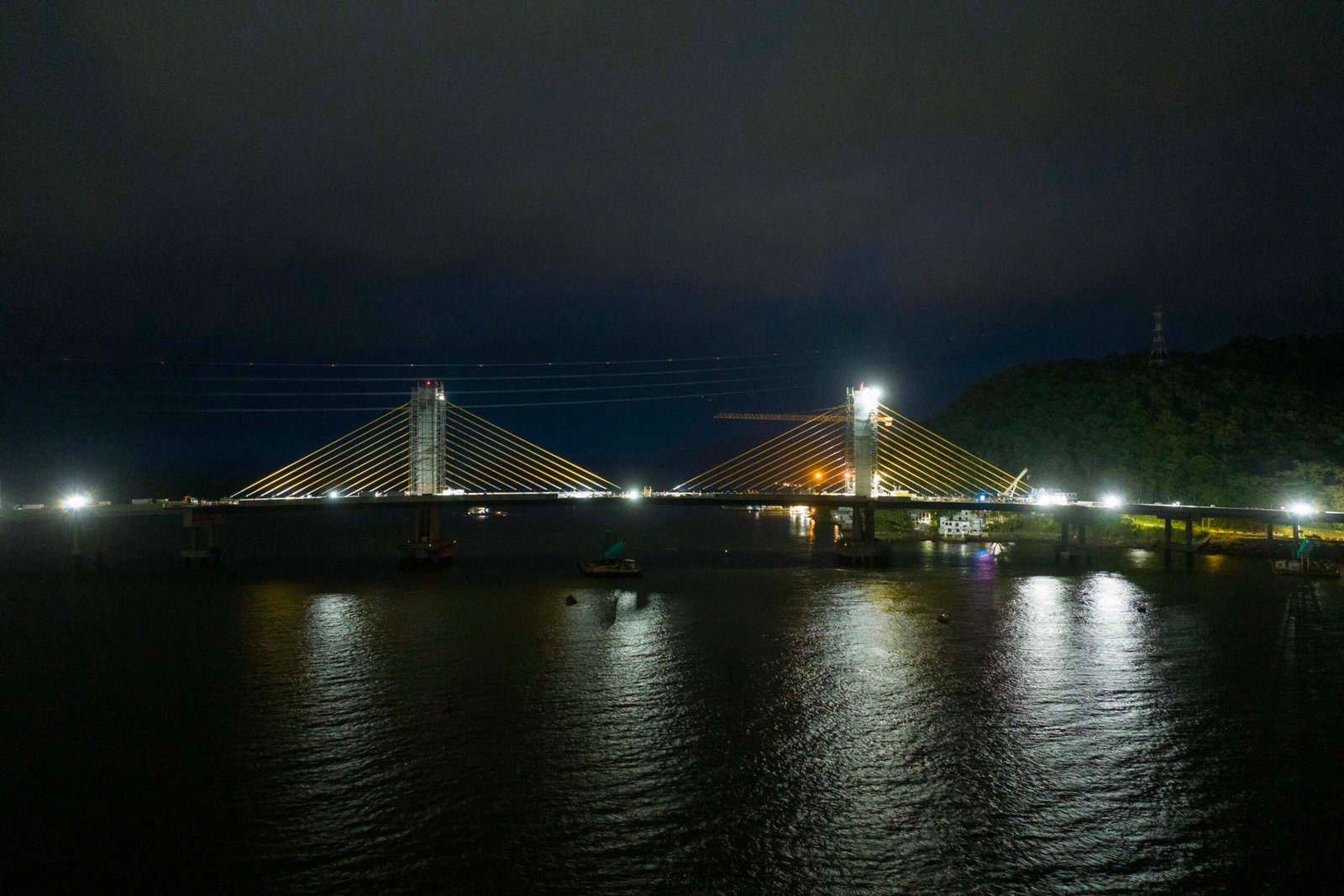 Os trabalhos na construção da Ponte de Guaratuba seguem a todo vapor, 24 horas por dia. Mesmo com a ligação definitiva, os serviços seguem inclusive à noite e estão concentrados na fase de acabamentos e acessos. Os trabalhos de armação que foram feitos ao longo dos últimos meses durante as noites e madrugadas para apoiar os trabalhos diurnos já encerraram.