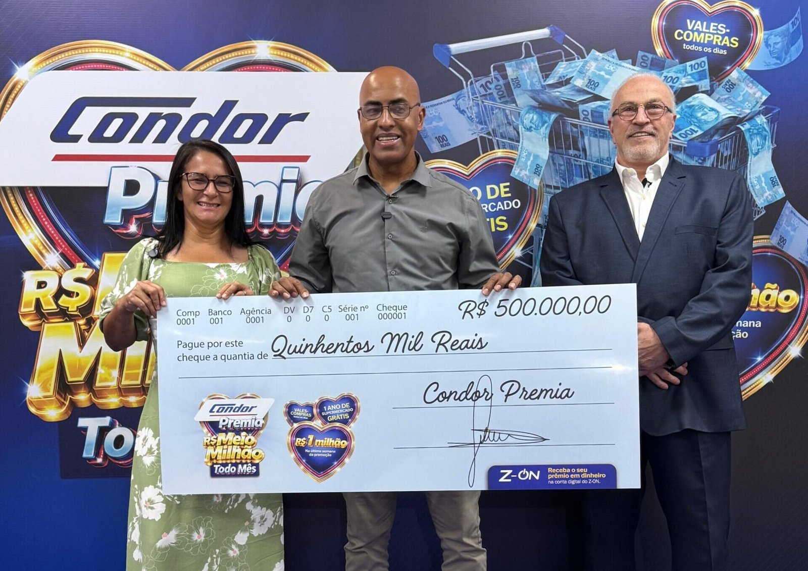 O Condor Premia está sorteando 11 prêmios de R$ 500 mil, um prêmio final de R$ 1 milhão, vales-compras diários de R$ 500 e 52 prêmios de um ano de supermercado grátis, no valor de R$ 1 mil mensais, todos sorteados pela Loteria Federal.