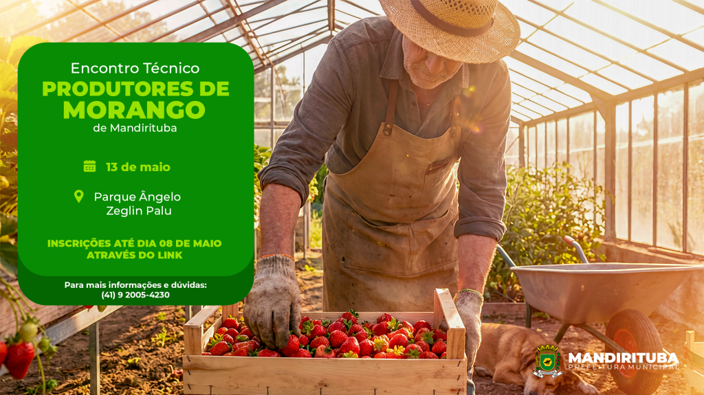 A Prefeitura de Mandirituba, por meio da Secretaria de Agricultura e Meio Ambiente, realiza no dia 13 de maio de 2026 o Encontro Técnico de Produtores de Morango, iniciativa voltada ao fortalecimento da cadeia produtiva e à qualificação dos produtores do município e da região.